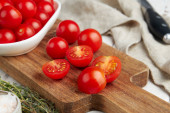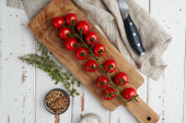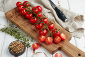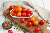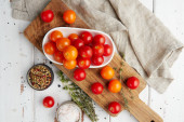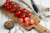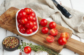 Świeże czerwone pomidory wiśniowe na białym drewnianym tle