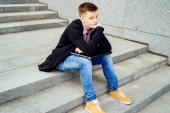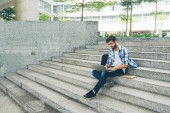 Młody człowiek siedzi na kamiennych schodach w parku i czyta przewodnik. Podróżuje samotnie po mieście. Turystyka miejska. Nowoczesne zabytki architektury.