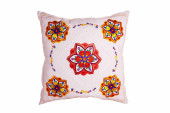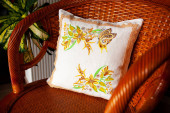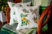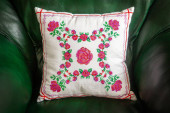 Ręcznie robiona poduszka dekoracyjna z haftem różanym na zielonej skórzanej sofie.
