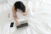 kobieta za pomocą laptopa biały na łóżku biały w sypialni domu do miękkiego sportu ostrości