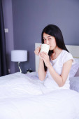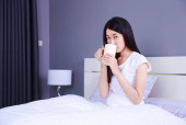 portret kobieta tajski model są picie kawy w księżycowej sypialni na wakacje do miękkiego sportu ostrość rozmyte tło