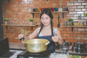 kobiet łódź makaron sklep tajski styl i tajskie jedzenie dla turystów podróżować na rynku wody amphawa w Tajlandii