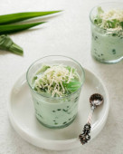 Zielona galaretka z trawy lub Cincau Hijau w szklance, tradycyjny indonezyjski deser wykonany z liści Cyclea barbata. Podawany z syropem z cukru palmowego i mlekiem kokosowym do łamania postu podczas Ramadan