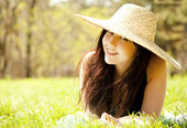 Zdjęcie "piękna brunetka dziewczyna w kapeluszu w parku." może być wykorzystywane do celów osobistych i komercyjnych zgodnie z warunkami zakupionej licencji Royalty-free. Obraz jest dostępny do pobrania w jakości wysokiej rozdzielczości do 5760x3840.