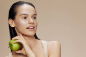 portret kobieta szczęśliwy uśmiech zielony jabłko zdrowie odizolowane tło