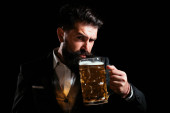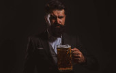 Piwne puby i bary. Facet trzymający kubek piwa. Szczęśliwy browar trzymający szkło z piwem.