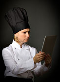 kobieta kucharz z tabletek na ciemnym tle