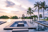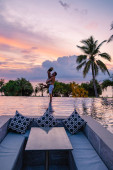 Zachód słońca na Cosy Beach Pattaya Tajlandia, para mężczyzn i kobiet oglądających zachód słońca przy basenie w Pattaya Tajlandia