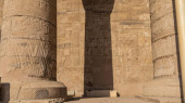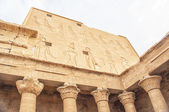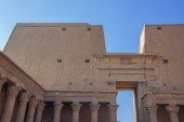 Fragment starożytnej świątyni Horusa w Edfu. Widoczne są kolumny ze stolicami o różnych kształtach. Na wysokim murze są rzeźby bogów. Błękitne niebo. Stany Zjednoczone