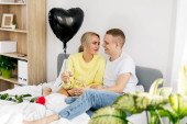 Młoda kobieta siedzi na mężach w kuchni i uśmiecha się. Młoda para dobrze się bawi podczas miesiąca miodowego.