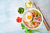 Zdjęcie "Tajskie jedzenie smażone makaron tajski styl z kiełkiem fasoli krewetki i ozdobić orzeszki ziemne chili puder cytryna limonka cukrowa, Stir-fry makaron Pad tajski na talerzu serwowane na stole żywności - widok z góry" może być wykorzystywane do celów osobistych i komercyjnych zgodnie z warunkami zakupionej licencji Royalty-free. Obraz jest dostępny do pobrania w jakości wysokiej rozdzielczości do 5760x3840.