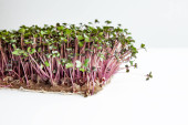 Zbliżenie mikro-zielonych rzodkiewek - zielonych liści i fioletowych łodyg. Mikrozielony kiełkujący. Kiełkowanie nasion w domu