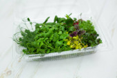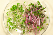 Zdjęcie "Zbliżenie mikro-zielonych rzodkiewek - zielonych liści i fioletowych łodyg. Mikrozielony kiełkujący. Kiełkowanie nasion w domu" może być wykorzystywane do celów osobistych i komercyjnych zgodnie z warunkami zakupionej licencji Royalty-free. Obraz jest dostępny do pobrania w jakości wysokiej rozdzielczości do 5760x3840.