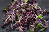 Zbliżenie mikro-zielonych rzodkiewek - zielonych liści i fioletowych łodyg. Mikrozielony kiełkujący. Kiełkowanie nasion w domu