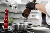 Profesjonalny kucharz w białych solach mundurowych krewetek królewskich. Szlifierka do soli drewnianej.