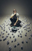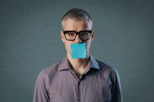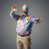 Zabawny biznesmen pokryty lepkimi notatkami, patrzy w kamerę