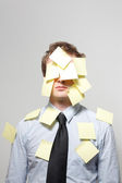 Zabawny człowiek okrywający się kolorowymi lepkimi nutami