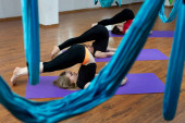Grupa młodych pięknych kobiet jogi robi ćwiczenia jogi lotniczej w hamakach w klubie fitness
