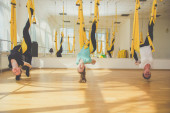 Grupa młodych pięknych kobiet jogi robi ćwiczenia jogi lotniczej w hamakach w klubie fitness