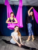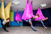 Zdjęcie "Grupa młodych pięknych kobiet jogi robi ćwiczenia jogi lotniczej w hamakach w klubie fitness" może być wykorzystywane do celów osobistych i komercyjnych zgodnie z warunkami zakupionej licencji Royalty-free. Obraz jest dostępny do pobrania w jakości wysokiej rozdzielczości do 5760x3840.
