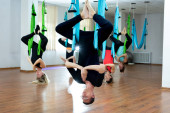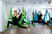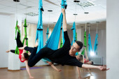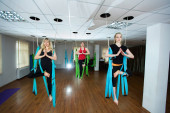 Grupa młodych pięknych kobiet jogi robi ćwiczenia jogi lotniczej w hamakach w klubie fitness