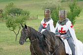 Średniowieczni rycerze, ubrany w średniowiecznych ubraniach przejażdżkę wzdłuż rive