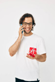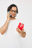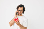 Atrakcyjny mężczyzna rozmawia przez telefon pudełko odosobnione tło
