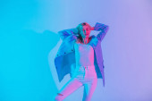 Ładna moda młoda blondynka kobieta z modnymi ubraniami z niebieskim vintage marynarka, biała bluzka stanowi wewnątrz na kolorowe neon różowe tło światła