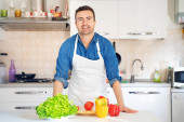 Zdjęcie "Portret jednego człowieka gotującego w domu krojąc warzywa" może być wykorzystywane do celów osobistych i komercyjnych zgodnie z warunkami zakupionej licencji Royalty-free. Obraz jest dostępny do pobrania w jakości wysokiej rozdzielczości do 5760x3840.