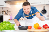 Zdjęcie "Portret jednego człowieka gotującego w domu krojąc warzywa" może być wykorzystywane do celów osobistych i komercyjnych zgodnie z warunkami zakupionej licencji Royalty-free. Obraz jest dostępny do pobrania w jakości wysokiej rozdzielczości do 5760x3840.