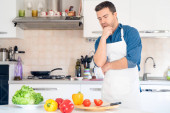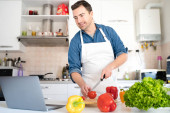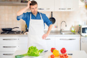 Jeden człowiek śpiewa w kuchni podczas gotowania.
