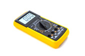 Nowoczesny przenośny przenośny multimetr cyfrowy z wyświetlaczem LCD w gumowej osłonie ochronnej na białym tle