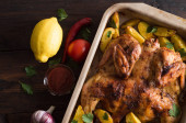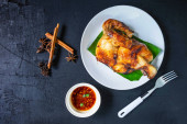 Grillowane dania z kurczaka i sos do zanurzania z piekarnika na czarnym tle