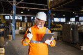 Portret pracownika fizycznego z tabletem stojącym w fabryce przy maszynie produkcyjnej.