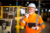 Zdjęcie "Portret pracownika fizycznego z tabletem stojącym w fabryce przy maszynie produkcyjnej." może być wykorzystywane do celów osobistych i komercyjnych zgodnie z warunkami zakupionej licencji Royalty-free. Obraz jest dostępny do pobrania w jakości wysokiej rozdzielczości do 5760x3840.