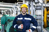 Zdjęcie "Pracownik zakładu w mundurze ochronnym z komputerowym sterowaniem tabletem przemysłowego ramienia robota w dziale produkcji." może być wykorzystywane do celów osobistych i komercyjnych zgodnie z warunkami zakupionej licencji Royalty-free. Obraz jest dostępny do pobrania w jakości wysokiej rozdzielczości do 5760x3840.