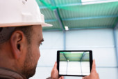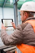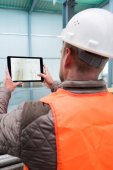 Widok górny pracownika fabryki noszącego mundur ochronny i twardy kapelusz, korzystającego z komputera typu tablet sterującego procesem produkcji.