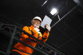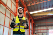 Zdjęcie "Pracownik fabryki stojący przy maszynach produkcyjnych i sprawdzający wyniki produkcji na tabletach." może być wykorzystywane do celów osobistych i komercyjnych zgodnie z warunkami zakupionej licencji Royalty-free. Obraz jest dostępny do pobrania w jakości wysokiej rozdzielczości do 5760x3840.