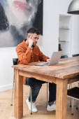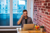 Afrykański amerykański freelancer rozmawia na smartfonie w pobliżu laptopa podczas pracy w domu