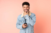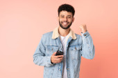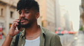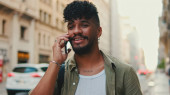 podekscytowany Afroamerykanin rozmawia przez telefon komórkowy w nowoczesnym mieszkaniu