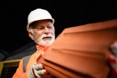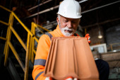Pracownik produkcji fabrycznej w sprzęcie zabezpieczającym trzymający dachówkę i sprawdzający jakość produktu dla budownictwa.
