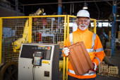 Pracownik produkcji fabrycznej w sprzęcie zabezpieczającym trzymający dachówkę i sprawdzający jakość produktu dla budownictwa.