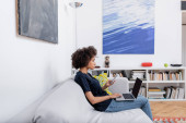 kręcone Afroamerykanka kobieta za pomocą telefonu komórkowego w pobliżu laptopa podczas siedzenia na kanapie