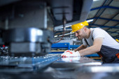 Udana produkcja płytek ceramicznych i pracownik fabryki sprawdzanie jakości koloru i tekstury.