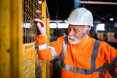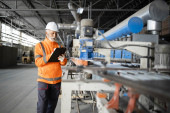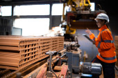 Fabryczny pracownik linii produkcyjnej sprawdza kolor, teksturę i chropowatość wyrobu płytek ceramicznych.