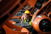 Doświadczony inżynier przemysłowy lub starszy pracownik fabryki obsługujący automat w hali produkcyjnej. Wnętrze fabryki w tle.