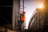 Zdjęcie "Inżynier przemysłowy w sprzęcie bezpieczeństwa i twardym kapeluszu wspinający się po metalowych schodach w fabryce." może być wykorzystywane do celów osobistych i komercyjnych zgodnie z warunkami zakupionej licencji Royalty-free. Obraz jest dostępny do pobrania w jakości wysokiej rozdzielczości do 5760x3840.