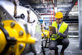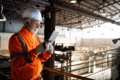 Nadzorca ds. pracowników przemysłowych stojący przy maszynie i sprawdzający produkcję w fabryce.