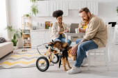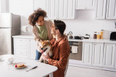 mężczyzna gospodarstwa śniadanie w pobliżu wesoły Afryki amerykańska dziewczyna zabawy z shiba inu pies na podłodze w kuchni