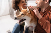 shiba inu pies patrząc na aparat w pobliżu zadowolony wielonarodowe para w kuchni